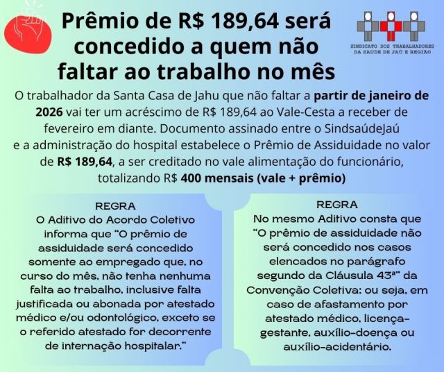 O trabalhador da Santa Casa de Jahu que não faltar a partir de janeiro de 2026 vai ter um acréscimo de R$ 189,64 ao Vale-Cesta de fevereiro em diante. Documento assinado entre o SindsaúdeJaú e a administração do hospital estabelece o Prêmio de Assiduidade no valor de R$ 189,64,a ser creditado no vale alimentação do funcionário, totalizando R$ 400 mensais (vale + prêmio) – hoje, o Vale-Cesta tem o valor de R$ 210,36.