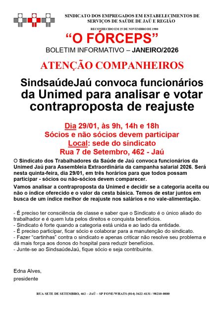 O Sindicato dos Trabalhadores da Saúde de Jaú convoca funcionários da Unimed Jaú para Assembleia Extraordinária da campanha salarial 2026. Será nesta quinta-feira, dia 29/01, em três horários para que todos possam participar - sócios ou não-sócios devem comparecer.