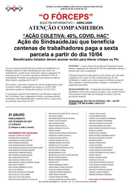 HAC: Ação do SindsaúdeJaú que beneficia centenas de trabalhadores paga a sexta parcela a partir do dia 10/04 - Beneficiados list