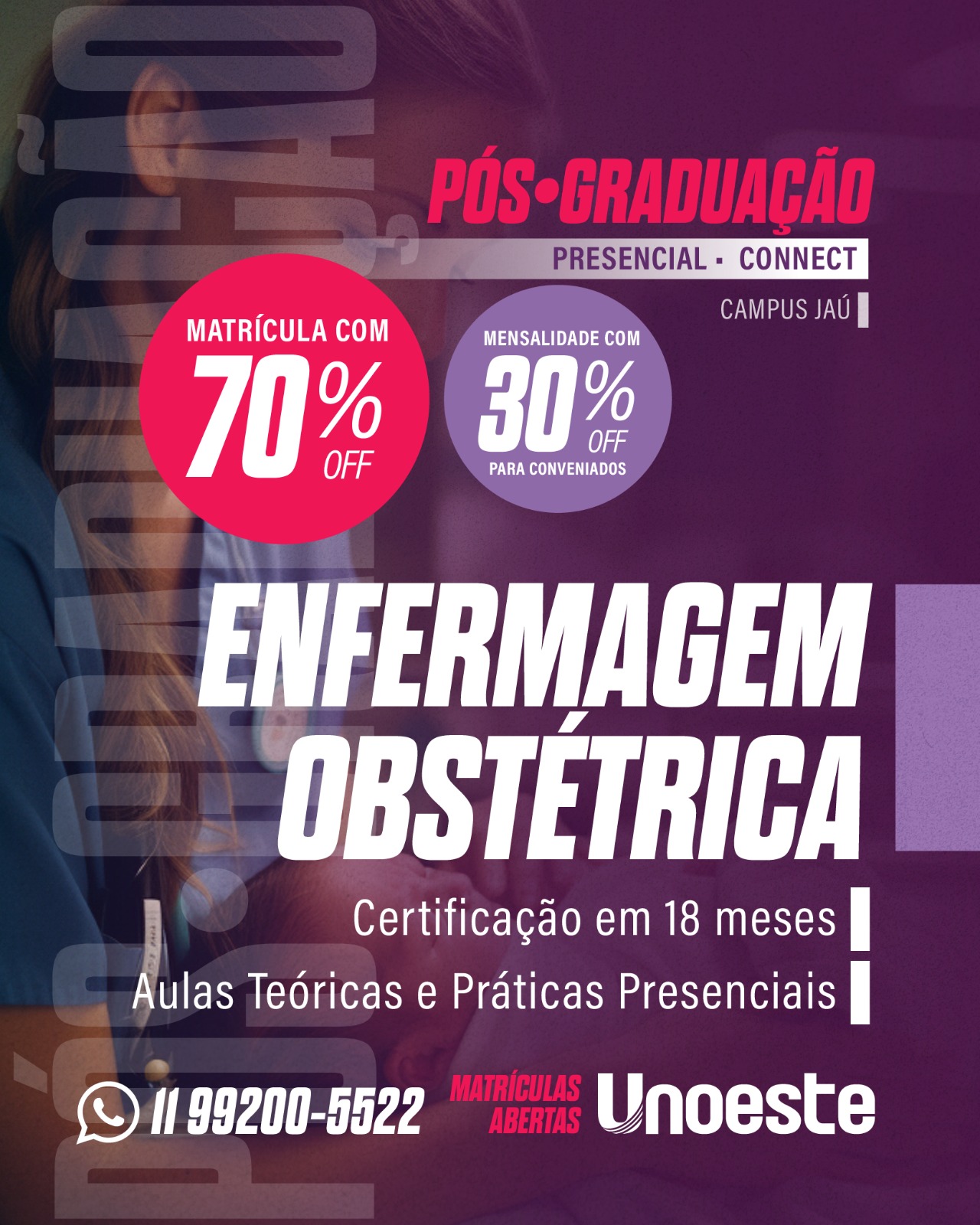 Curso de Enfermagem em ObstetrÃcia da Unoeste Jaú está com turma quase formada: matrÃculas até 25 de novembro