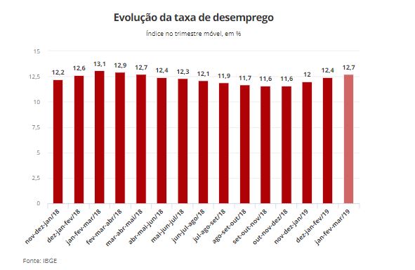 Trata-se da maior taxa de desemprego desde o trimestre terminado em maio de 2018, quando a taxa também ficou em 12,7%.