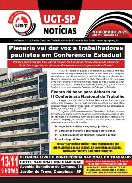 A UGT-SP, dando sequência aos trabalhos que realiza com o objetivo de elevar à categoria de protagonistas os sindicatos que a integram, vai realizar no dia 13 de novembro, a partir das 9 horas, uma plenária livre. O evento presencial, que acontece no Hotel Nacional Inn, em Campinas, deve reunir dezenas de lideranças trabalhistas de todo o Estado para formular um documento que será apresentado no encontro que as Centrais Sindicais promovem antes da Conferência Estadual do Trabalho.