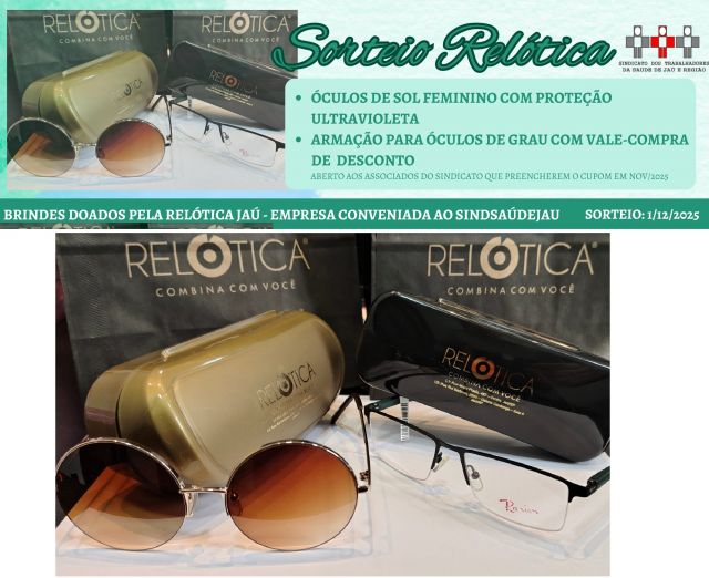 Para reforçar essa parceria, a ótica, joalheria e relojoaria Relótica ofereceu dois presentes para os associados do Sindicato dos Trabalhadores da Saúde de Jaú e Região. Um deles é um óculos de sol feminino com proteção ultravioleta; o outro é uma armação para óculos de grau com vale-compra de 30% de desconto para compra à vista ou 20% de desconto a prazo nas lentes nacionais.