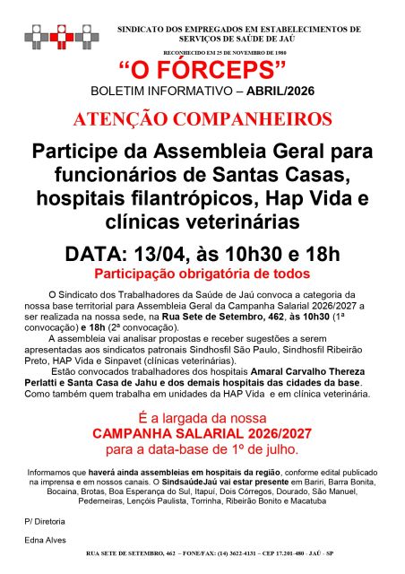 Participe da Assembleia Geral para funcionários de Santas Casas, hospitais filantrópicos, Hap Vida e clÃnicas veterinárias