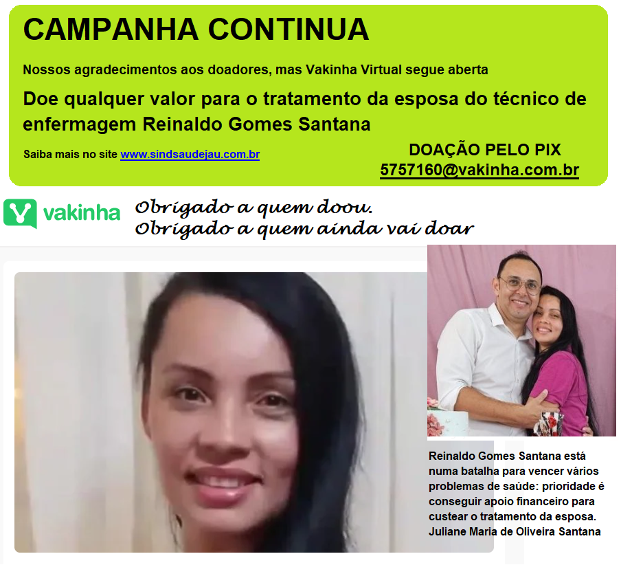“Nem que seja R$ 2,00 cada um ou algum valor maior que não venha a fazer falta para vocêâ€. Nossa categoria tem cerca de 5 mil trabalhadores na saúde em Jaú e região, portanto, a campanha em prol da Juliane Maria de Oliveira Santana  ainda pode crescer.
