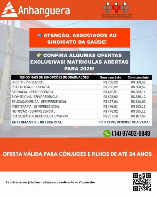 QUE TAL INVESTIR NA SUA CAPACITAÇÃO? EDUCAÇÃO É O MELHOR INVESTIMENTO. AINDA MAIS COM O DESCONTO DO CONVÊNIO ENTRE O SINDSAÚDEJAU E A Anhanguera Educacional de Jaú DETALHES PELO NUMERO 14 97402-5848
