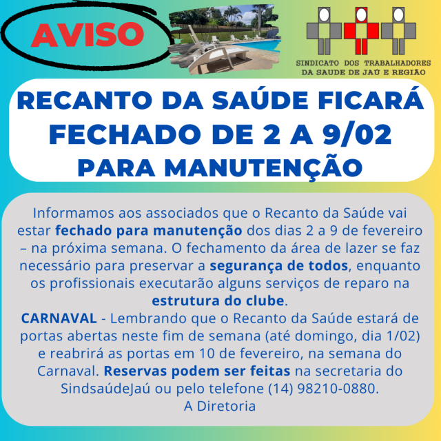 Lembrando que o Recanto da Saúde estará de portas abertas neste fim de semana (até domingo, dia 1/02) e reabrirá as portas em 10 de fevereiro, na semana do Carnaval. Reservas podem ser feitas na secretaria do SindsaúdeJaú ou pelo telefone (14) 98210-0880.